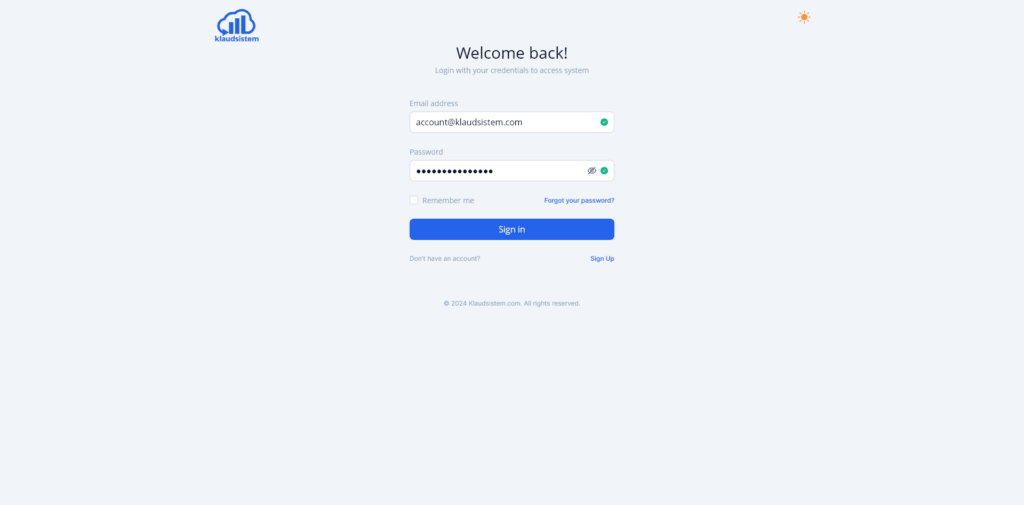 Untuk login, Anda bisa masuk ke https://apps.klaudsistem.com/login untuk mengisi kolom email dan password, lalu klik tombol Sign In.  Maka detik selanjutnya Anda sudah berada di dalam dashboard Klaudsistem